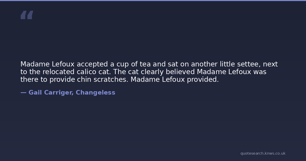 Madame Lefoux accepted a cup of tea and sat on another little settee, next to the relocated calico cat. The cat clearly believed Madame Lefoux was there to provide chin scratches. Madame Lefoux provided.