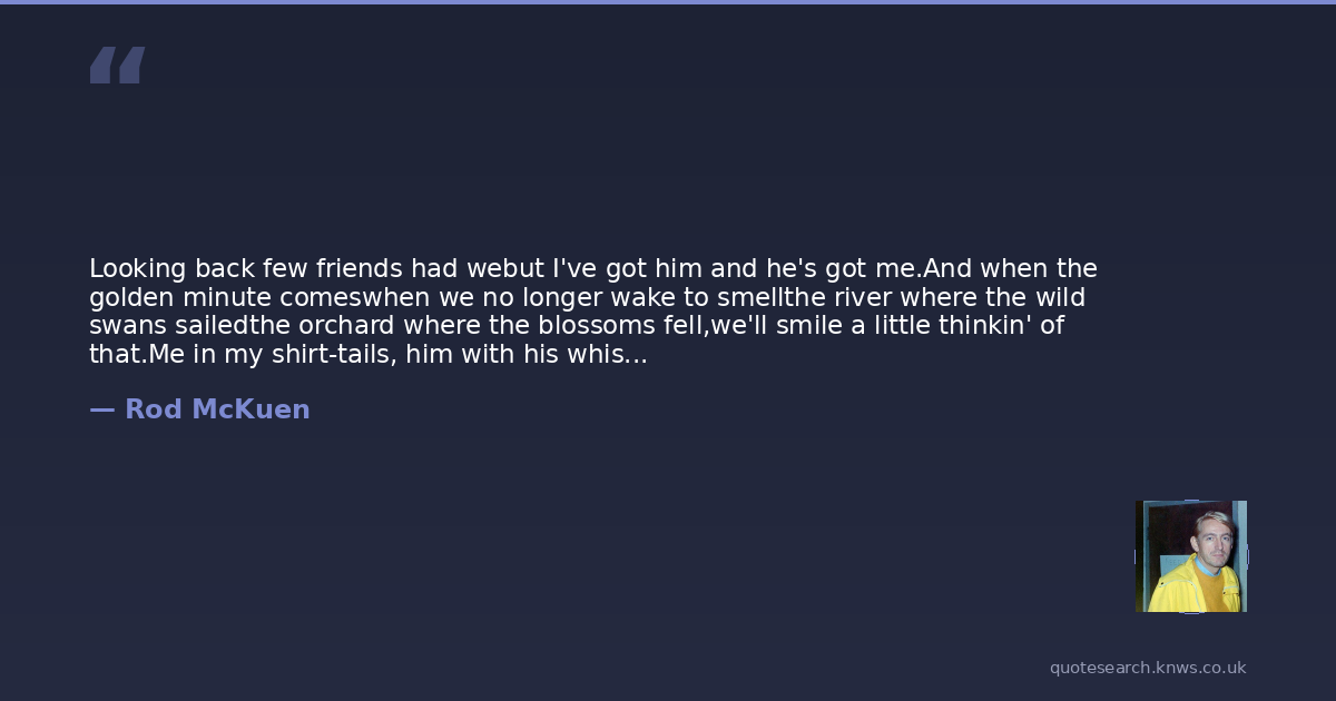 Rod McKuen was a 20th-century American poet, songwriter, composer, and singer. Rodney Marvin McKuen was an American poet, singer-songwriter and composer. He was one of the best-selling poets in the United States during the late 1960s. Read more on Wikipedia →