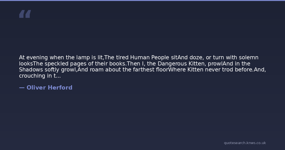 At evening when the lamp is lit,The tired Human People sitAnd doze, or turn with solemn looksThe speckled pages of their books.Then I, the Dangerous Kitten, prowlAnd in the Shadows softly growl,And roam about the farthest floorWhere Kitten never trod before.And, crouching in the jungle damp,I watch the Human Hunters camp,Ready to spring with fearful roarAs soon as I shall hear them snore.And then with stealthy tread I crawlInto the dark and trackless hall,Where 'neath the Hat-tree's shadows deepUmbrellas fold their wings and sleep.A cuckoo calls and to their densThe People climb like frightened hens,And I'm alone and no one caresIn Darkest Africa downstairs.