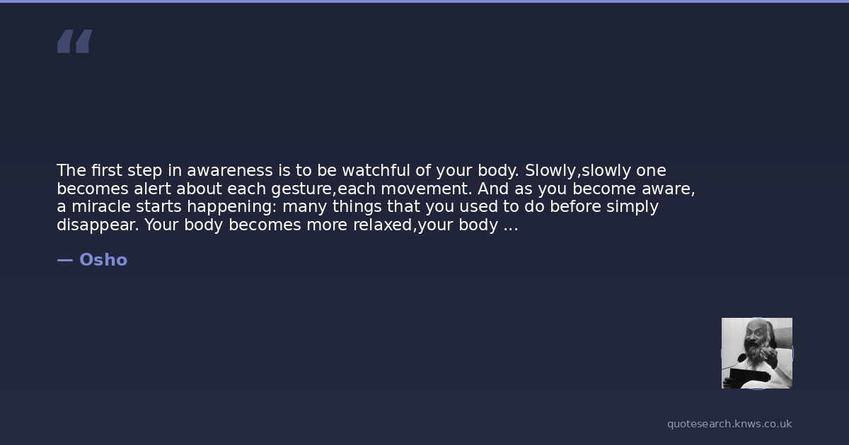 The first step in awareness is to be watchful of your body. Slowly,slowly one becomes alert about each gesture,each movement. And as you become aware, a miracle starts happening: many things that you used to do before simply disappear. Your body becomes more relaxed,your body becomes more attuned, a deep peace starts prevailing even in your body, a subtle music pulsates in your body.