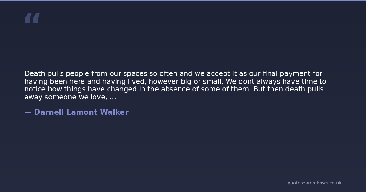 Death pulls people from our spaces so often and we accept it as our final payment for having been here and having lived, however big or small. We dont always have time to notice how things have changed in the absence of some of them. But then death pulls away someone we love, and we find that time. In here, we notice everything; growing grass and fingernails, and songs that end in a minor key. We are too sad to do anything else but watch a clock, applying seconds, minutes, and hours to the trauma and the lacerations. Time, the forever healer, they say. We find the time to wonder how everyone else is moving on, around our paralyzed selves. Ourselves unsure of roads and trees and birds and things. It all blurs and words arent words anymore. We find the time to attempt to figure a way to rethink everything we thought about this world and why we came to it.