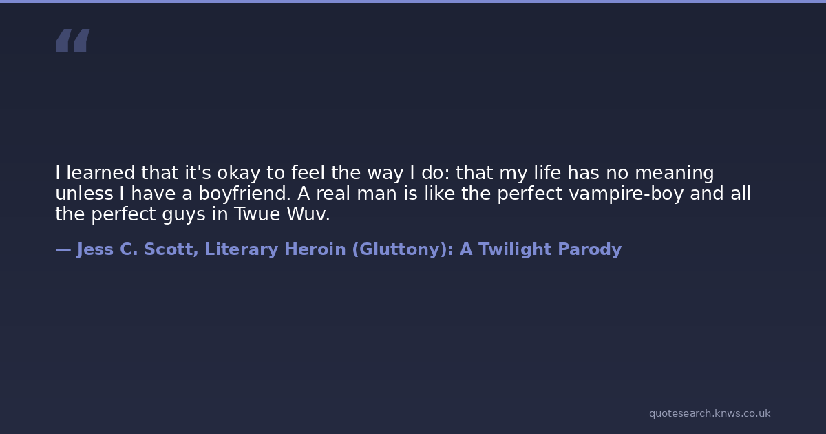 I learned that it's okay to feel the way I do: that my life has no meaning unless I have a boyfriend. A real man is like the perfect vampire-boy and all the perfect guys in Twue Wuv.