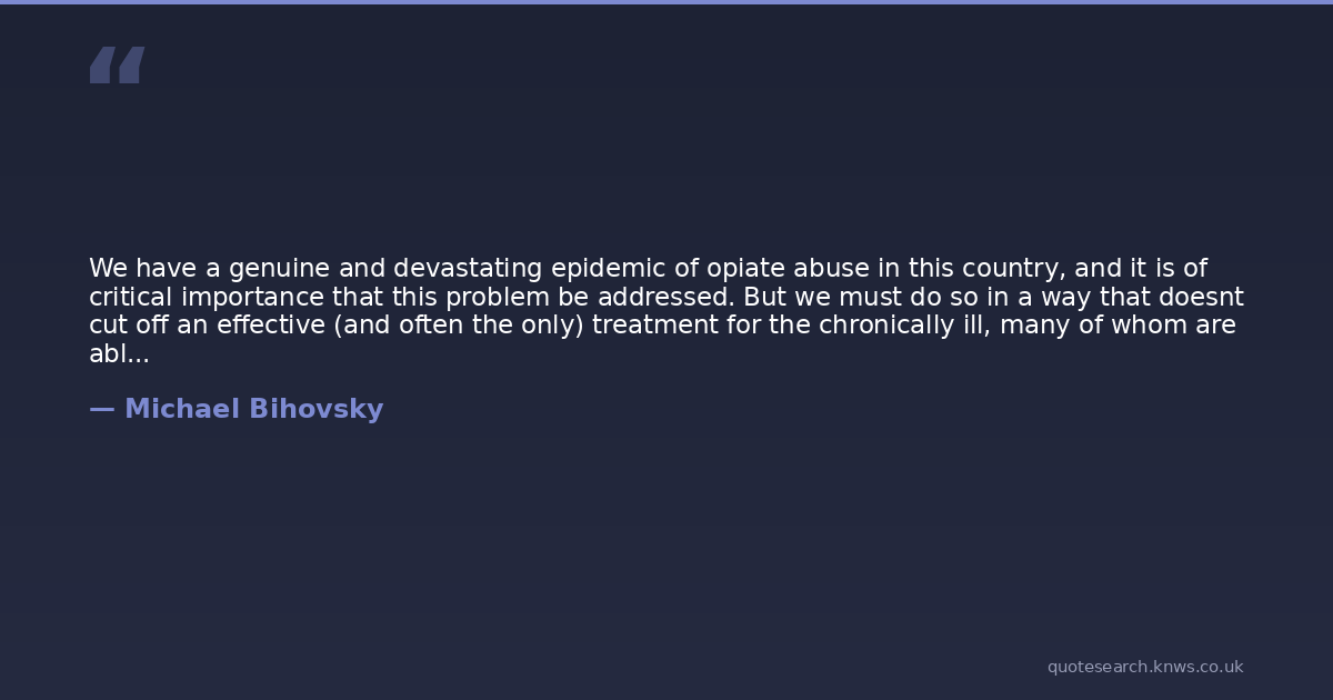We have a genuine and devastating epidemic of opiate abuse in this country, and it is of critical importance that this problem be addressed. But we must do so in a way that doesnt cut off an effective (and often the only) treatment for the chronically ill, many of whom are able to function in this world at all only because of the small respite that responsible opiate use provides.