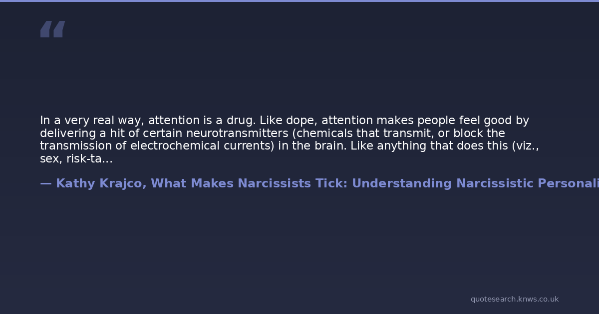 In a very real way, attention is a drug. Like dope, attention makes people feel good by delivering a hit of certain neurotransmitters (chemicals that transmit, or block the transmission of electrochemical currents) in the brain. Like anything that does this (viz., sex, risk-taking, power), in excessive amounts its addictive. And, simply because it works, nothing is as addictive as a pain killer. Hence Narcissus is well-named from the Greek word for narcosis.Attention is his pain killer.