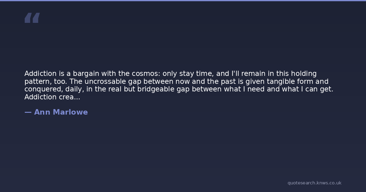 Addiction is a bargain with the cosmos: only stay time, and I'll remain in this holding pattern, too. The uncrossable gap between now and the past is given tangible form and conquered, daily, in the real but bridgeable gap between what I need and what I can get. Addiction creates a god so that time will stop--why all gods are created. God might be another story.