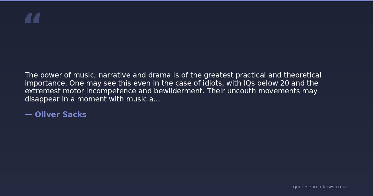 The power of music, narrative and drama is of the greatest practical and theoretical importance. One may see this even in the case of idiots, with IQs below 20 and the extremest motor incompetence and bewilderment. Their uncouth movements may disappear in a moment with music and dancingsuddenly, with music, they know how to move. We see how the retarded, unable to perform fairly simple tasks involving perhaps four or five movements or procedures in sequence, can do these perfectly if they work to musicthe sequence of movements they cannot hold as schemes being perfectly holdable as music, i.e. embedded in music. The same may be seen, very dramatically, in patients with severe frontal lobe damage and apraxiaan inability to do things, to retain the simplest motor sequences and programmes, even to walk, despite perfectly preserved intelligence in all other ways. This procedural defect, or motor idiocy, as one might call it, which completely defeats any ordinary system of rehabilitative instruction, vanishes at once if music is the instructor. All this, no doubt, is the rationale, or one of the rationales, of work songs.