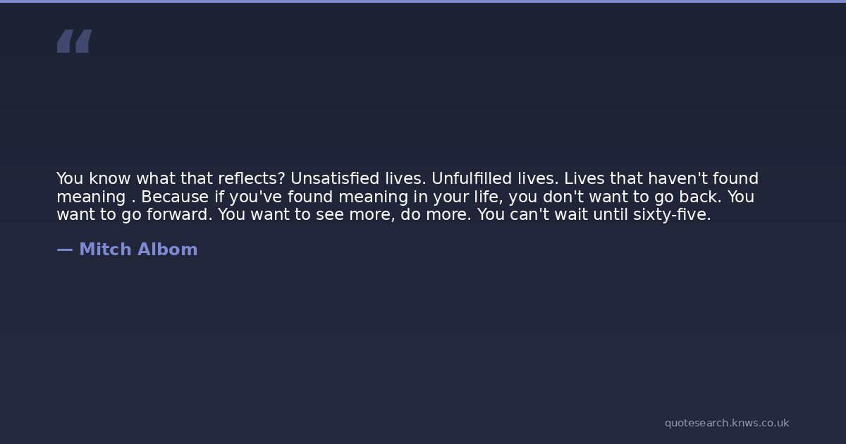 You know what that reflects? Unsatisfied lives. Unfulfilled lives. Lives that haven't found meaning . Because if you've found meaning in your life, you don't want to go back. You want to go forward. You want to see more, do more. You can't wait until sixty-five.