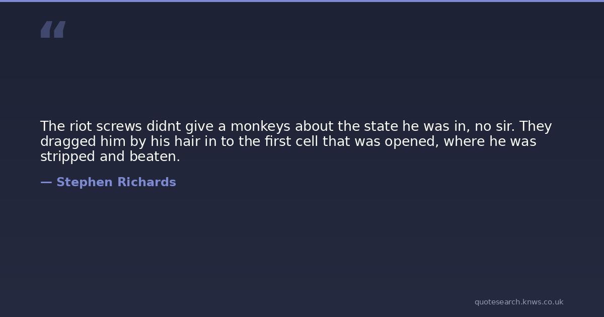The riot screws didnt give a monkeys about the state he was in, no sir. They dragged him by his hair in to the first cell that was opened, where he was stripped and beaten.