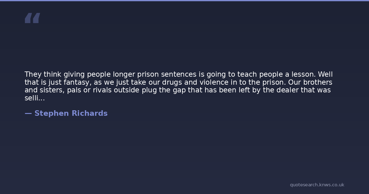 They think giving people longer prison sentences is going to teach people a lesson. Well that is just fantasy, as we just take our drugs and violence in to the prison. Our brothers and sisters, pals or rivals outside plug the gap that has been left by the dealer that was selling the crack or smack in the first place. Just like kamikazes, when one is dead, fifty queue up to take their place.