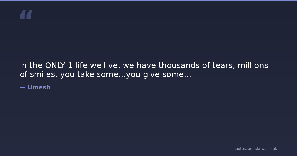in the ONLY 1 life we live, we have thousands of tears, millions of smiles, you take some...you give some... life-experience Download Image Share on X Share on Facebook Copy Link