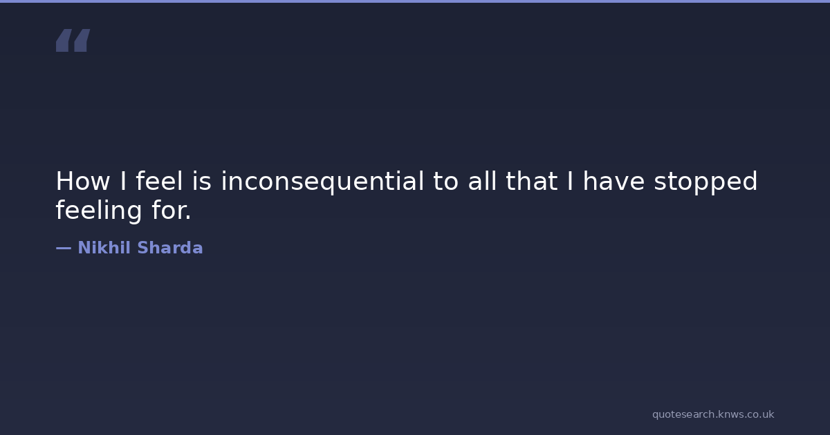 How I feel is inconsequential to all that I have stopped feeling for. life-experience Download Image Share on X Share on Facebook Copy Link