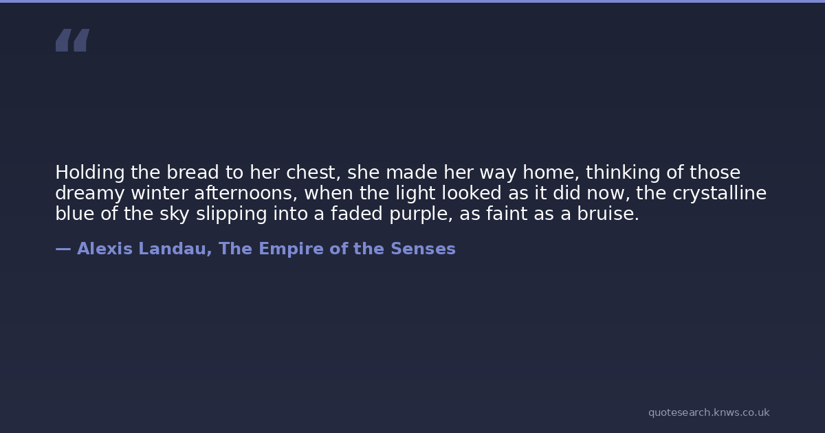 Holding the bread to her chest, she made her way home, thinking of those dreamy winter afternoons, when the light looked as it did now, the crystalline blue of the sky slipping into a faded purple, as faint as a bruise.