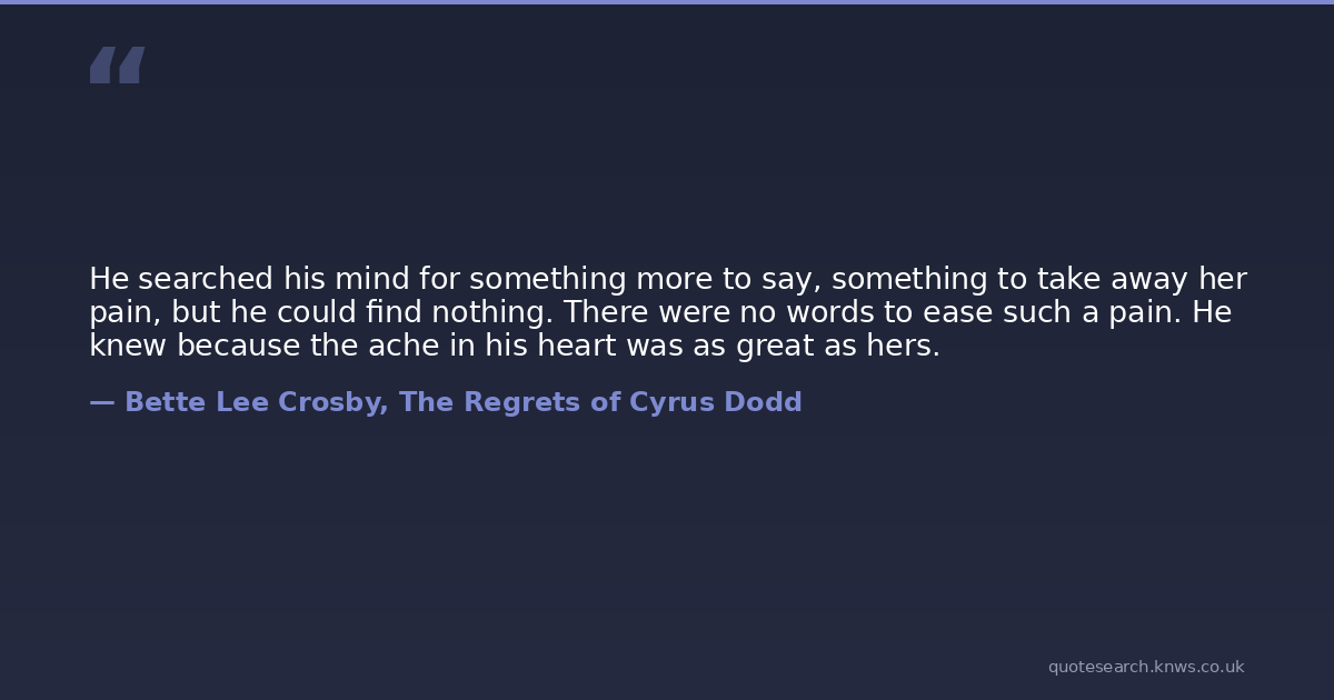 He searched his mind for something more to say, something to take away her pain, but he could find nothing. There were no words to ease such a pain. He knew because the ache in his heart was as great as hers.