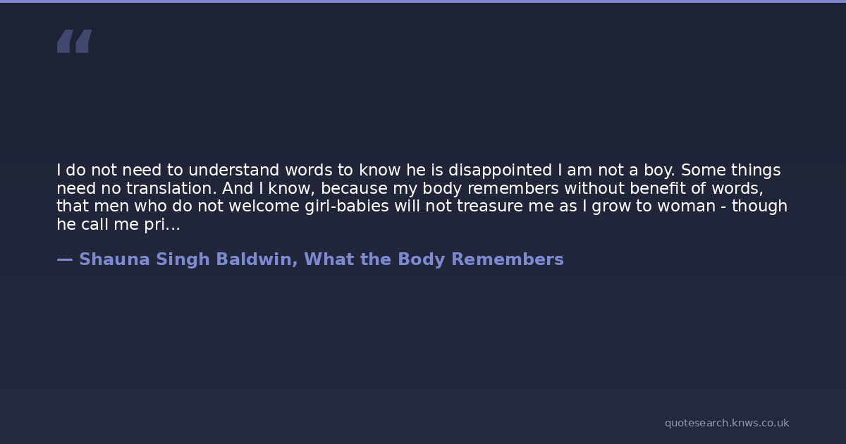 I do not need to understand words to know he is disappointed I am not a boy. Some things need no translation. And I know, because my body remembers without benefit of words, that men who do not welcome girl-babies will not treasure me as I grow to woman - though he call me princess just because the Guru told him to.I have come so far, I have borne so much pain and emptiness!But men have not yet changed.