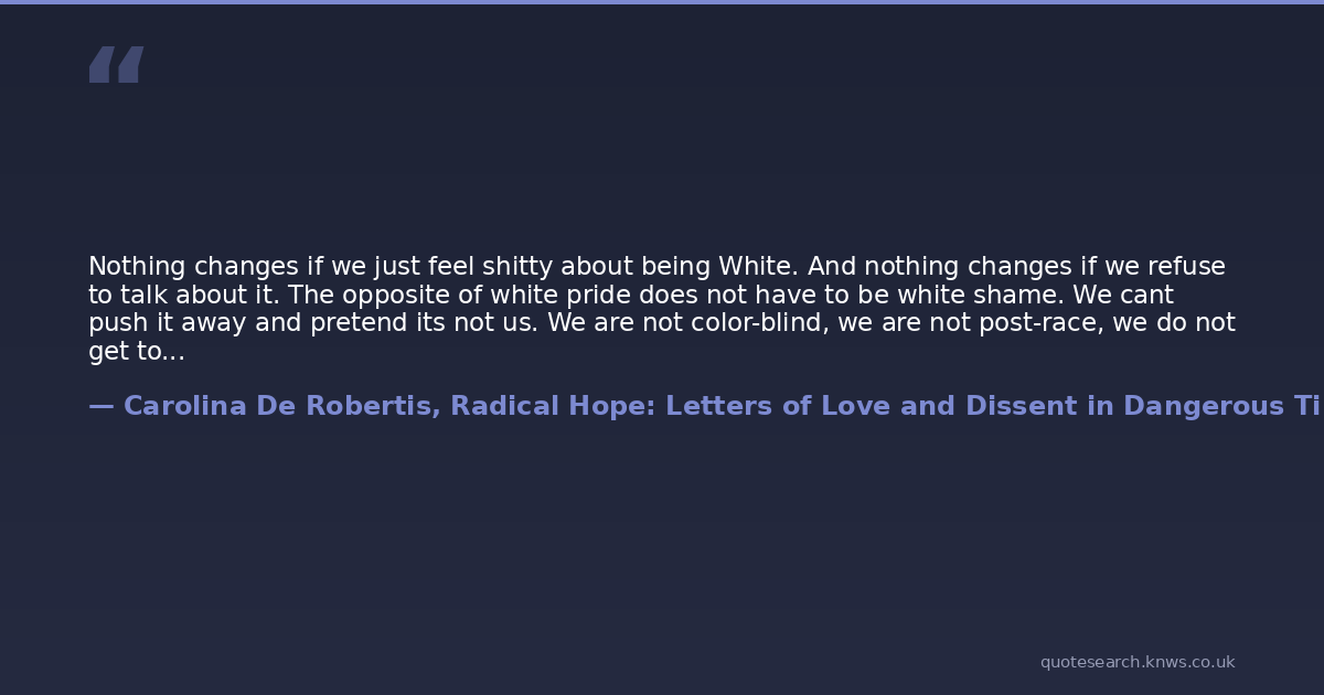 Nothing changes if we just feel shitty about being White. And nothing changes if we refuse to talk about it. The opposite of white pride does not have to be white shame. We cant push it away and pretend its not us. We are not color-blind, we are not post-race, we do not get to reject our whiteness because it makes us feel badThis does not get solved with a Celebration of Diversity Day and a coexist bumper sticker. (Kate Schatz)