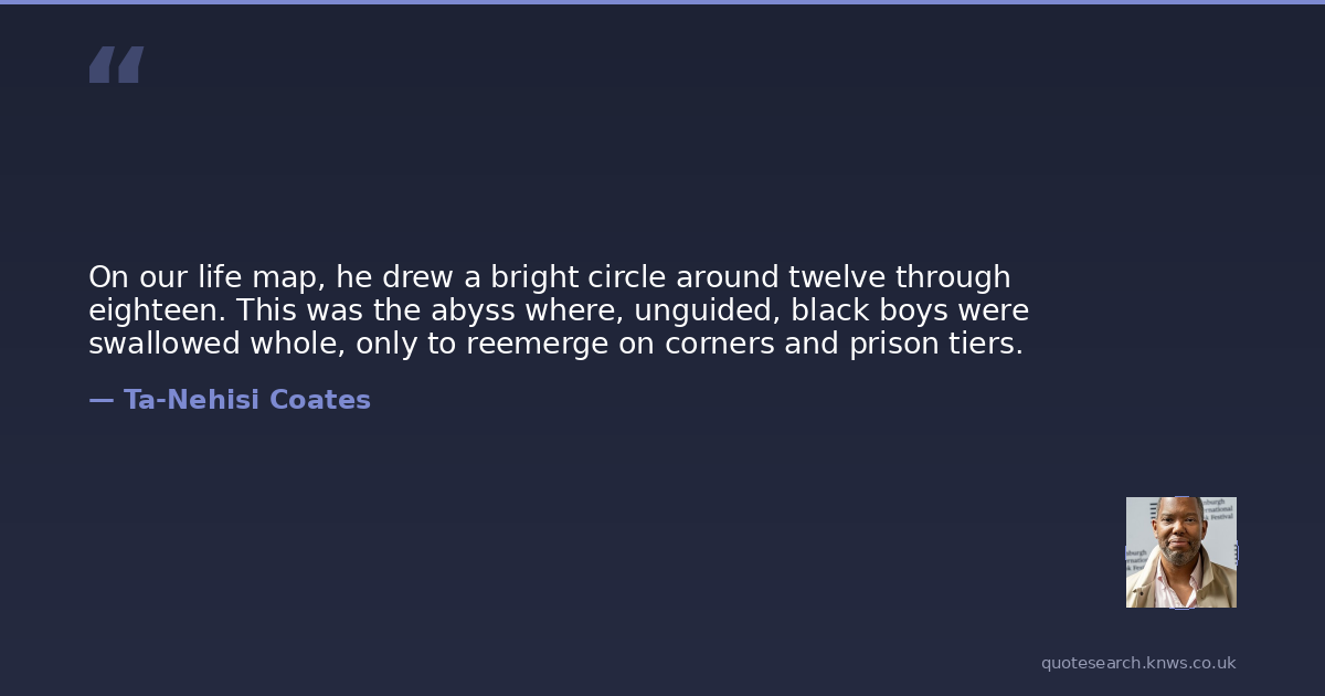 On our life map, he drew a bright circle around twelve through eighteen. This was the abyss where, unguided, black boys were swallowed whole, only to reemerge on corners and prison tiers.