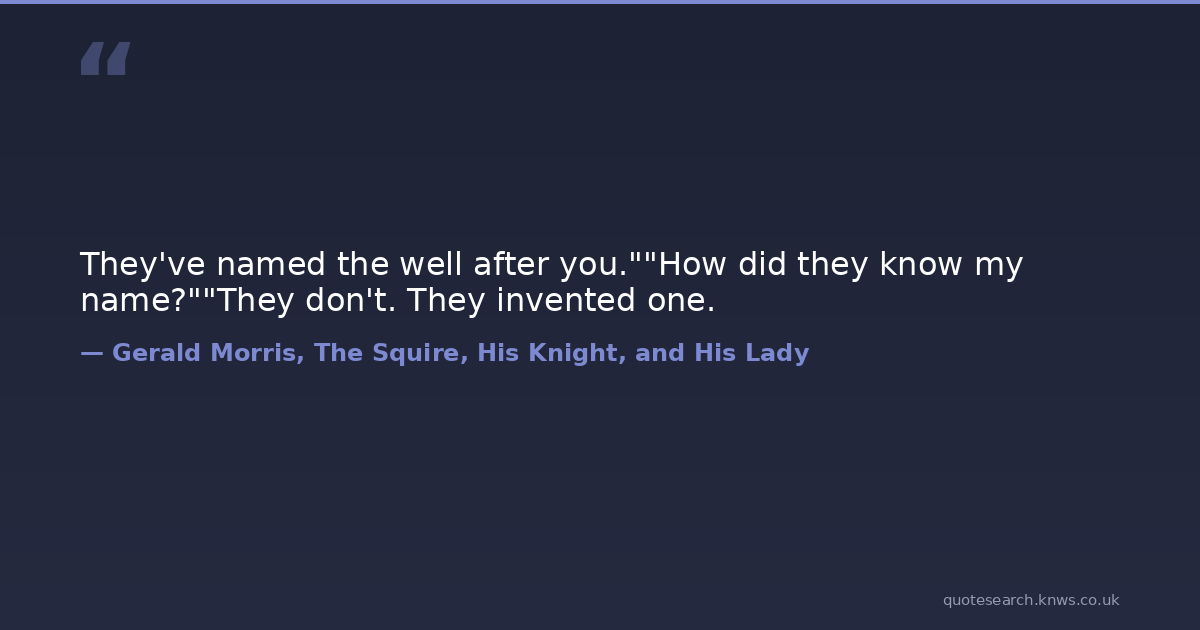 They've named the well after you.""How did they know my name?""They don't. They invented one. honor names Download Image Share on X Share on Facebook Copy Link