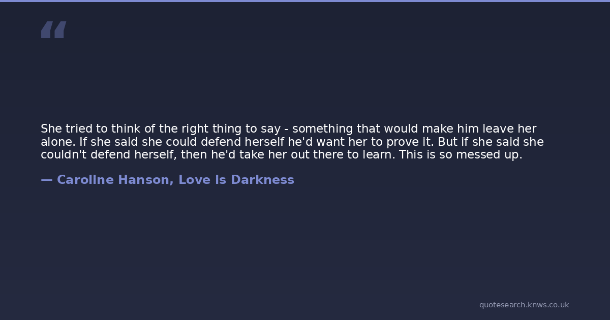 She tried to think of the right thing to say - something that would make him leave her alone. If she said she could defend herself he'd want her to prove it. But if she said she couldn't defend herself, then he'd take her out there to learn. This is so messed up.