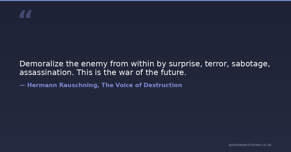 Demoralize the enemy from within by surprise, terror, sabotage, assassination. This is the war of the future. historical-fiction Download Image Share on X Share on Facebook Copy Link