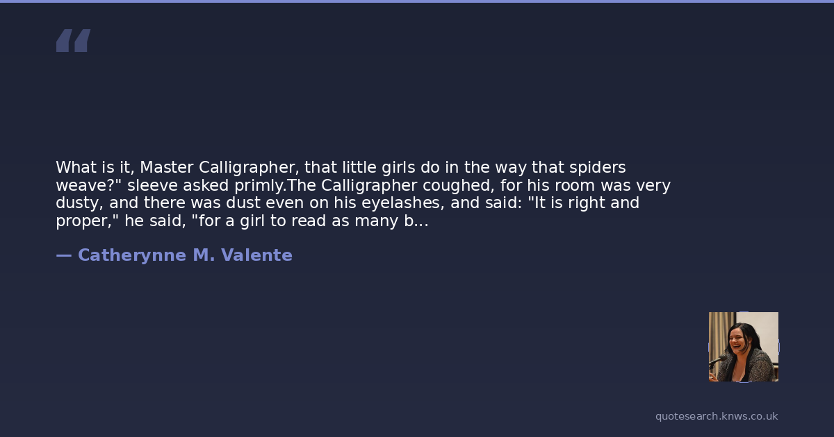 What is it, Master Calligrapher, that little girls do in the way that spiders weave?" sleeve asked primly.The Calligrapher coughed, for his room was very dusty, and there was dust even on his eyelashes, and said: "It is right and proper," he said, "for a girl to read as many books as there are bricks in this city, and then, when she is finished, to begin to write new ones which are made out of the old ones, as this city is made of those stones.