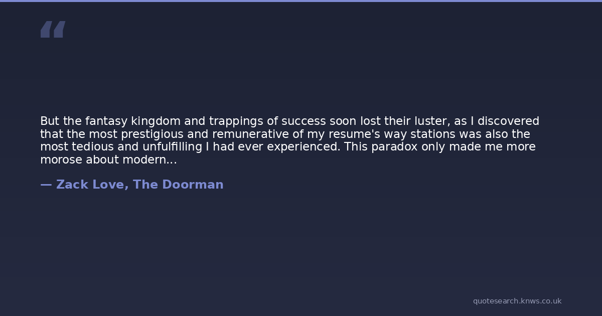 But the fantasy kingdom and trappings of success soon lost their luster, as I discovered that the most prestigious and remunerative of my resume's way stations was also the most tedious and unfulfilling I had ever experienced. This paradox only made me more morose about modernity. Why was I going to watch my hairline recede in front of two-thousand-line spreadsheets staring at me from cold, glowing monitors? Why was everyone in my office apparently so happy to be spending so many hours there, when the things they really cared about - people, pets, pastimes - were all relegated to a few photographs on their desks? That seemed to be the formula: spend the best years of your life in an office with photos of what you really care about.