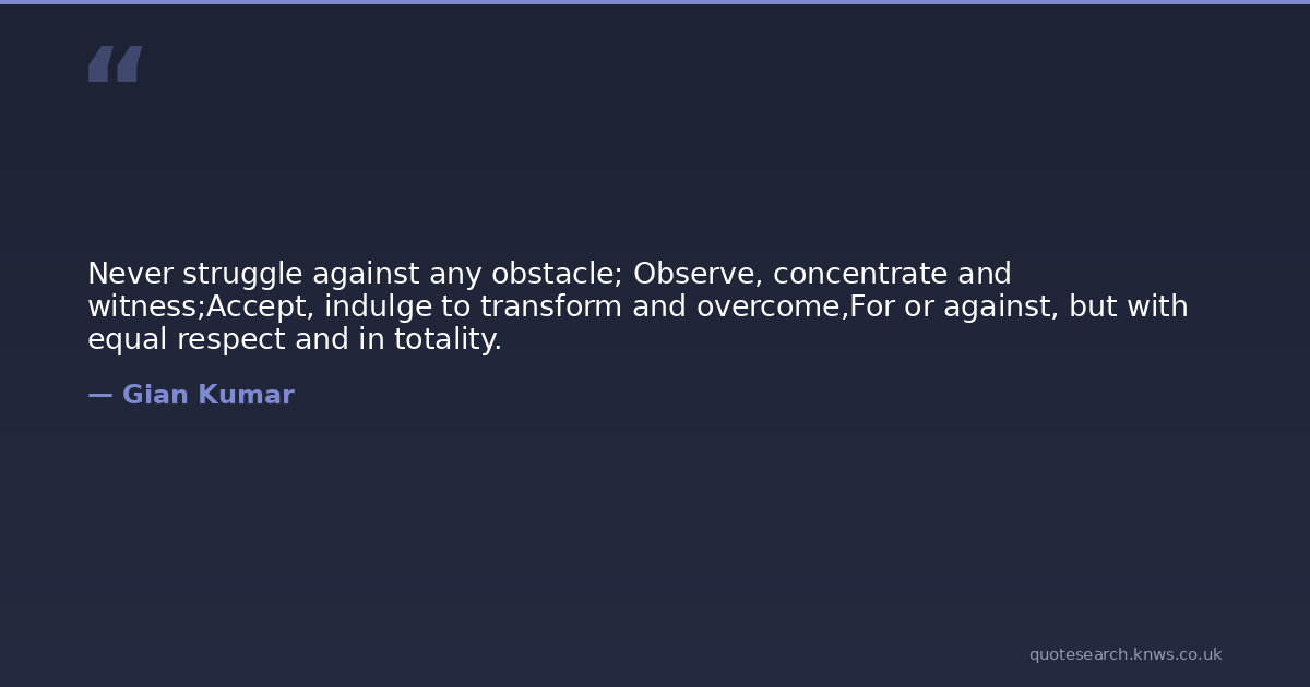 Never struggle against any obstacle; Observe, concentrate and witness;Accept, indulge to transform and overcome,For or against, but with equal respect and in totality.
