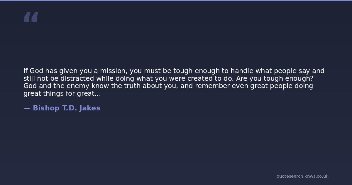 If God has given you a mission, you must be tough enough to handle what people say and still not be distracted while doing what you were created to do. Are you tough enough? God and the enemy know the truth about you, and remember even great people doing great things for great causes meet negative criticisms. All criticism is not bad, just like all flattery is not good. Many times people dont criticize you because they are evil; they do it because they have been trained to think anyone who doesn't perceive and see things in the same manner is an enemy. The critic is a prisoner to his own experiences and perspectives, erroneously believing his limited experiences are the sum of all truth. When you acknowledge your critics, you give them your power and validate their words. They are not important until you respond.