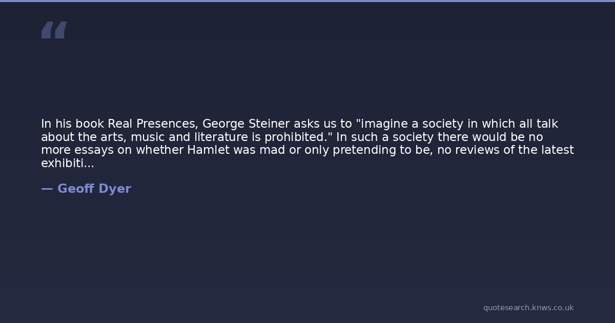 Geoff Dyer was a contemporary English writer. Geoff Dyer is an English author. He has written a number of novels and non-fiction books, some of which have won literary awards. Read more on Wikipedia →
