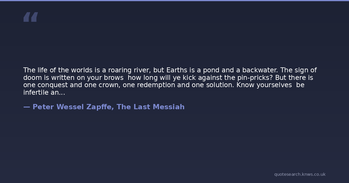 The life of the worlds is a roaring river, but Earths is a pond and a backwater. The sign of doom is written on your brows how long will ye kick against the pin-pricks? But there is one conquest and one crown, one redemption and one solution. Know yourselves be infertile and let the earth be silent after ye.