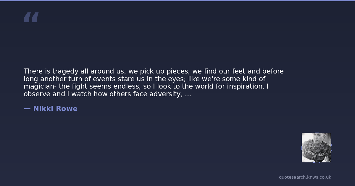 There is tragedy all around us, we pick up pieces, we find our feet and before long another turn of events stare us in the eyes; like we're some kind of magician- the fight seems endless, so I look to the world for inspiration. I observe and I watch how others face adversity, some hide from it, some master each lesson and some create a life with it... Our lessons don't define us, our integrity to keep rising after every fall is.
