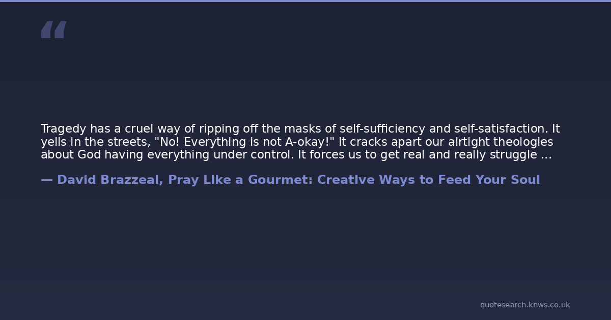 Tragedy has a cruel way of ripping off the masks of self-sufficiency and self-satisfaction. It yells in the streets, "No! Everything is not A-okay!" It cracks apart our airtight theologies about God having everything under control. It forces us to get real and really struggle with the big questions of life. It cautions us that this life journey we are on is not easily comprehended with a few sermon points but demands a lifetime of wisdom to even begin to fathom.