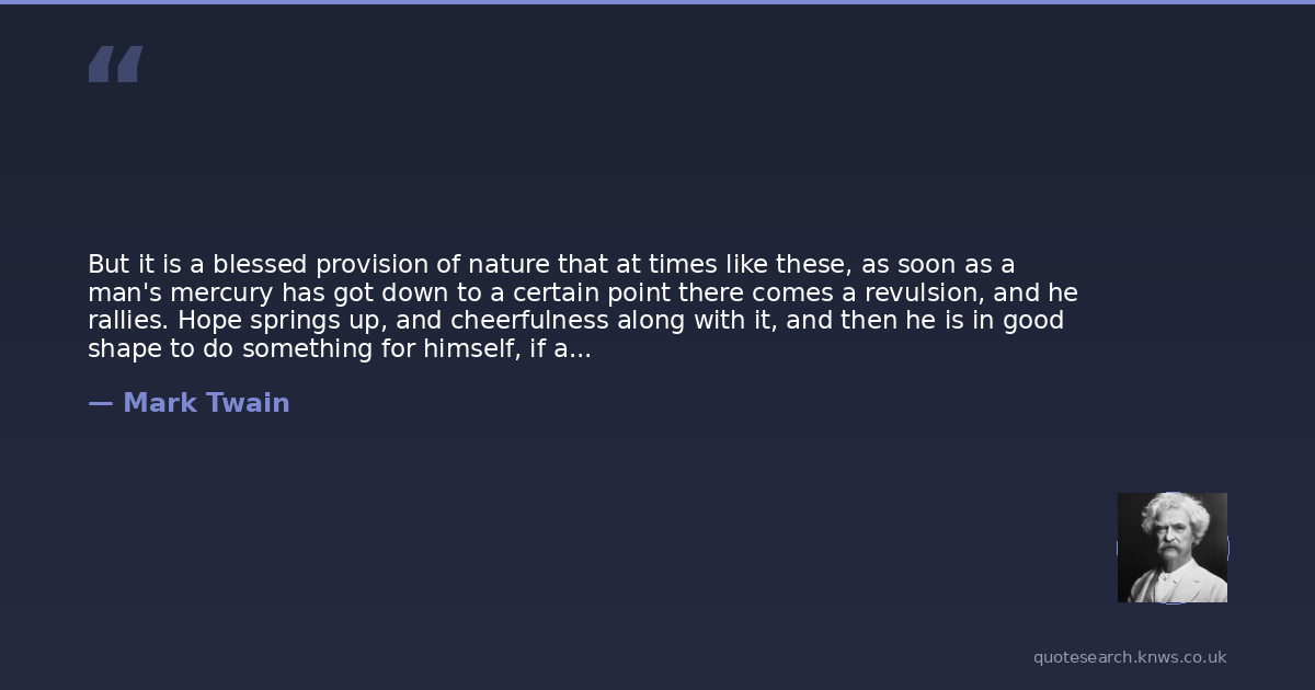 But it is a blessed provision of nature that at times like these, as soon as a man's mercury has got down to a certain point there comes a revulsion, and he rallies. Hope springs up, and cheerfulness along with it, and then he is in good shape to do something for himself, if anything can be done.