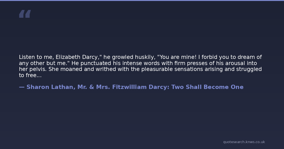 Listen to me, Elizabeth Darcy," he growled huskily, "You are mine! I forbid you to dream of any other but me." He punctuated his intense words with firm presses of his arousal into her pelvis. She moaned and writhed with the pleasurable sensations arising and struggled to free her captive arms,but he held her fast. He moved his lips along her neck and shoulders, tenderly nibbling and sucking