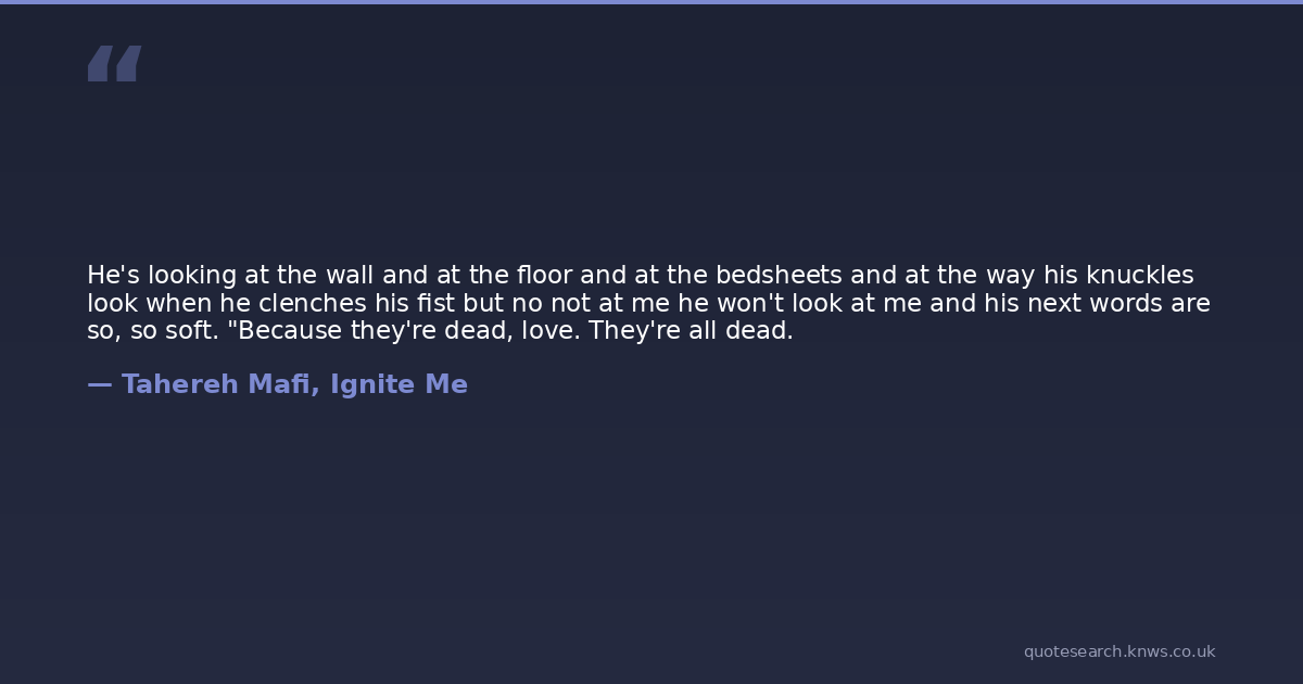 He's looking at the wall and at the floor and at the bedsheets and at the way his knuckles look when he clenches his fist but no not at me he won't look at me and his next words are so, so soft. "Because they're dead, love. They're all dead.
