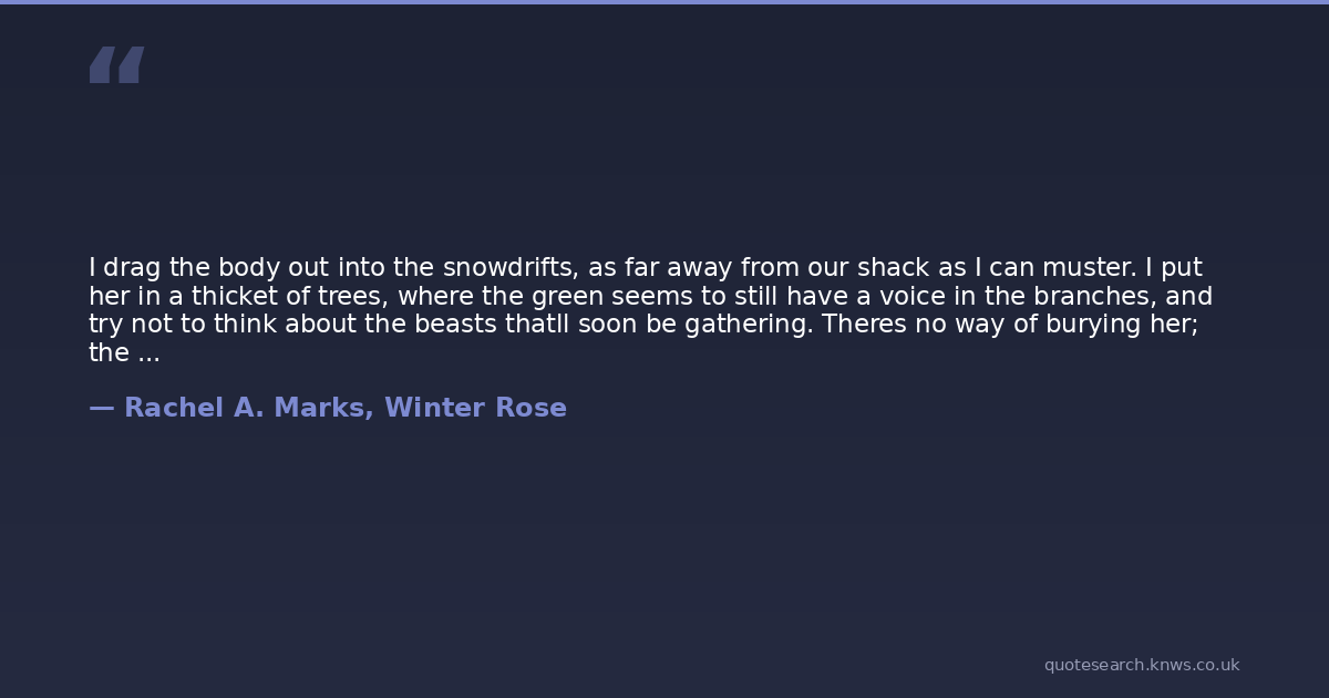 I drag the body out into the snowdrifts, as far away from our shack as I can muster. I put her in a thicket of trees, where the green seems to still have a voice in the branches, and try not to think about the beasts thatll soon be gathering. Theres no way of burying her; the ground is a solid rock of ice beneath us.I kneel beside her and want desperately to weep. My throat tightens and my head aches. Everything hurts inside. But I have no way of releasing it. Im locked up and hard as stone.Im sorry, Mamma, I whisper to the shell in front of me. I take her hand. It could belong to a glass doll. Theres no life there anymore. So I gather rocks, one by one, and set them over her, trying my best to protect her from the birds, the beasts, keep her safe as much as I can now. I pile the dark stones gently on her stomach, her arms, and over her face, until she becomes one with the mountain. I stand and study my work, feeling like the rocks are on me instead, then I leave the body for the forest and ice.
