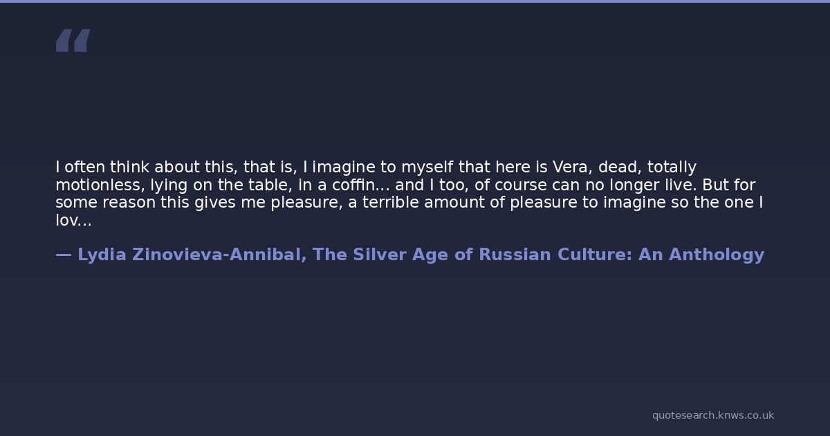 I often think about this, that is, I imagine to myself that here is Vera, dead, totally motionless, lying on the table, in a coffin... and I too, of course can no longer live. But for some reason this gives me pleasure, a terrible amount of pleasure to imagine so the one I love: earlier I imagined grandmother and then my fiance in this manner, even my favorite animals, Sparky our cat with the fiery bursts of red on his gray-black fur.("Thirty-Three Abominations")