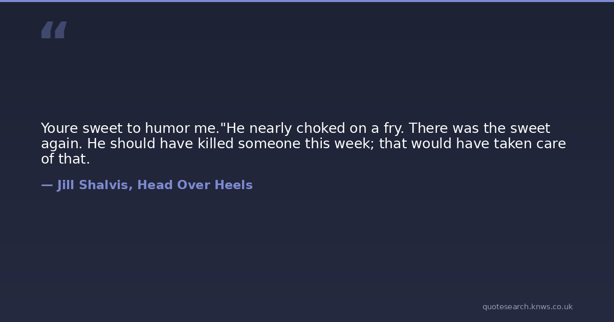 Youre sweet to humor me."He nearly choked on a fry. There was the sweet again. He should have killed someone this week; that would have taken care of that.