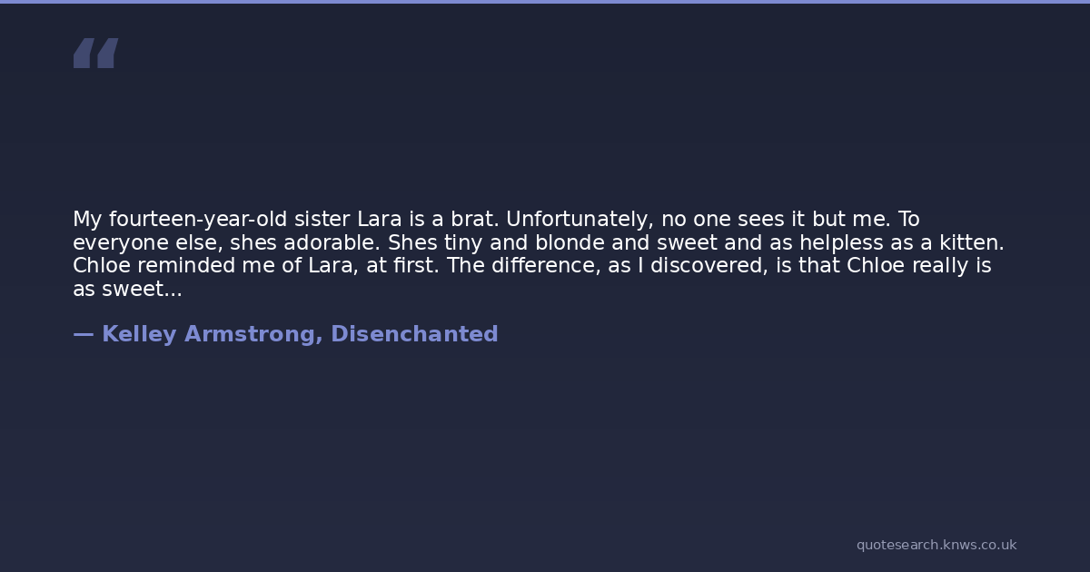 My fourteen-year-old sister Lara is a brat. Unfortunately, no one sees it but me. To everyone else, shes adorable. Shes tiny and blonde and sweet and as helpless as a kitten. Chloe reminded me of Lara, at first. The difference, as I discovered, is that Chloe really is as sweet as she seems and she isnt as helpless as she looks.