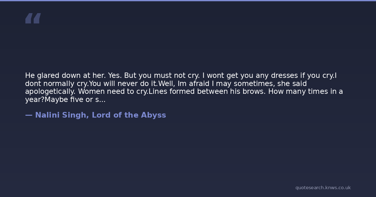 He glared down at her. Yes. But you must not cry. I wont get you any dresses if you cry.I dont normally cry.You will never do it.Well, Im afraid I may sometimes, she said apologetically. Women need to cry.Lines formed between his brows. How many times in a year?Maybe five or six, she said, thinking about it. But really, its usually a very small cry and not in front of anyoneAt that, his scowl grew even darker. I will permit you to cry four times a year. And you will do it when I am here.