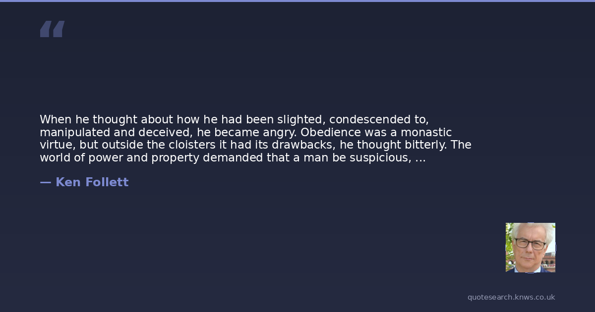 When he thought about how he had been slighted, condescended to, manipulated and deceived, he became angry. Obedience was a monastic virtue, but outside the cloisters it had its drawbacks, he thought bitterly. The world of power and property demanded that a man be suspicious, demanding, and insistent.