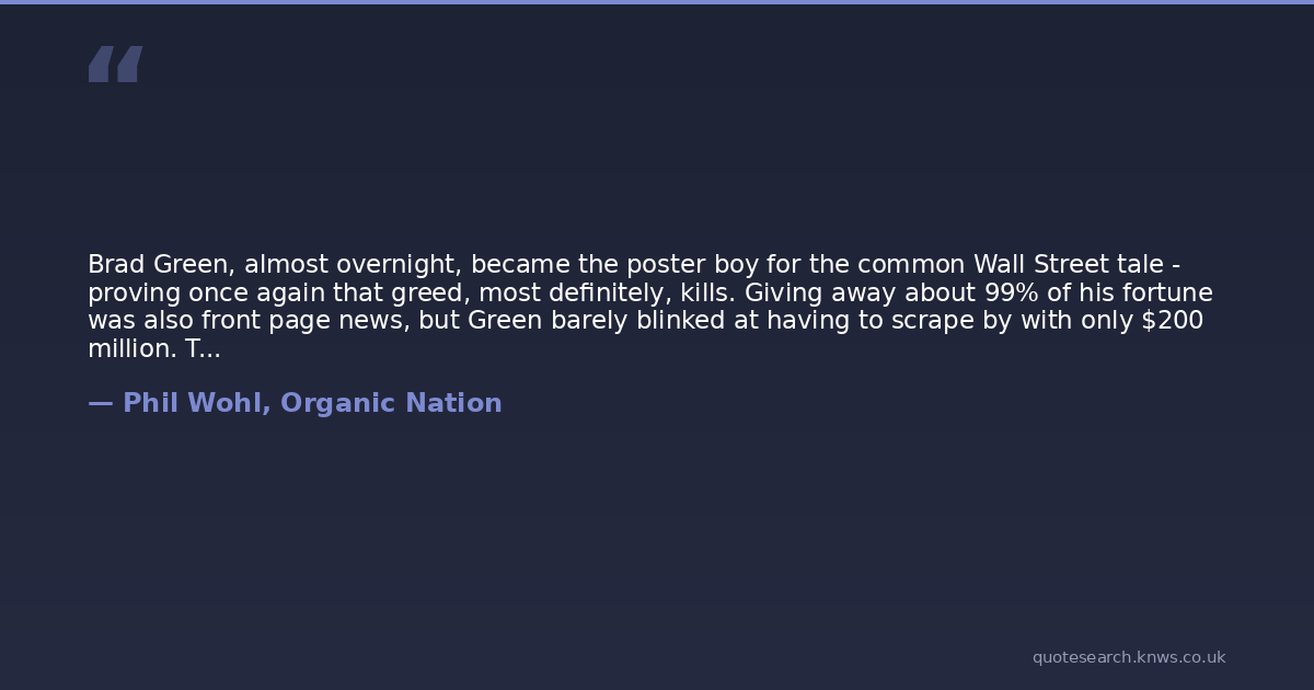 Brad Green, almost overnight, became the poster boy for the common Wall Street tale - proving once again that greed, most definitely, kills. Giving away about 99% of his fortune was also front page news, but Green barely blinked at having to scrape by with only $200 million. The government seized all five of his homes, his three boats, two jets, a helicopter, 14 cars, and all of his assets except the $200 million he stashed for a rainy day in an offshore bank account.