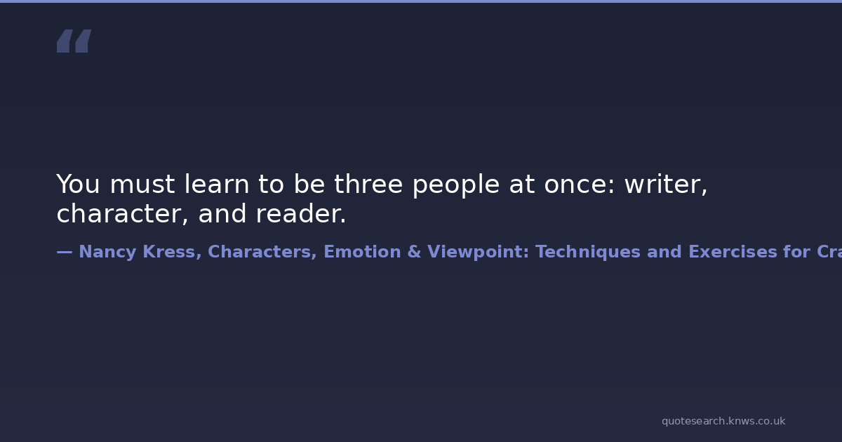 You must learn to be three people at once: writer, character, and reader. character-development writing-advice Download Image Share on X Share on Facebook Copy Link