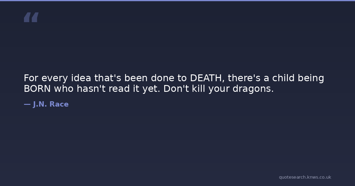 For every idea that's been done to DEATH, there's a child being BORN who hasn't read it yet. Don't kill your dragons. writing-advice Download Image Share on X Share on Facebook Copy Link