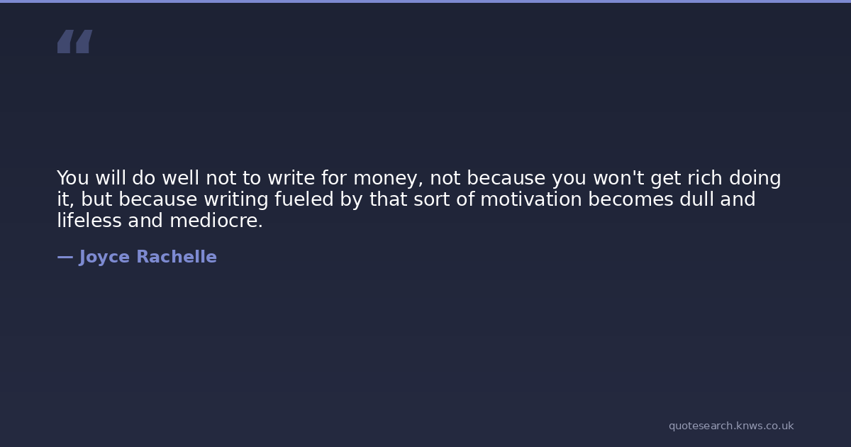 You will do well not to write for money, not because you won't get rich doing it, but because writing fueled by that sort of motivation becomes dull and lifeless and mediocre.