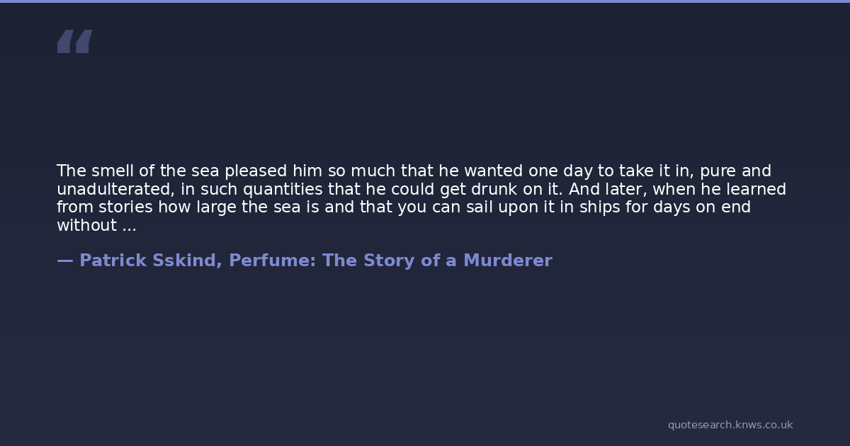 The smell of the sea pleased him so much that he wanted one day to take it in, pure and unadulterated, in such quantities that he could get drunk on it. And later, when he learned from stories how large the sea is and that you can sail upon it in ships for days on end without ever seeing land, nothing pleased him more than the image of himself sitting high up in the crow's nest of the foremost mast on such a ship, gliding on through the endless smell of the sea -- which really was no smell, but a breath, an exhilaration of breath, the end of all smells -- dissolving with pleasure in that breath.