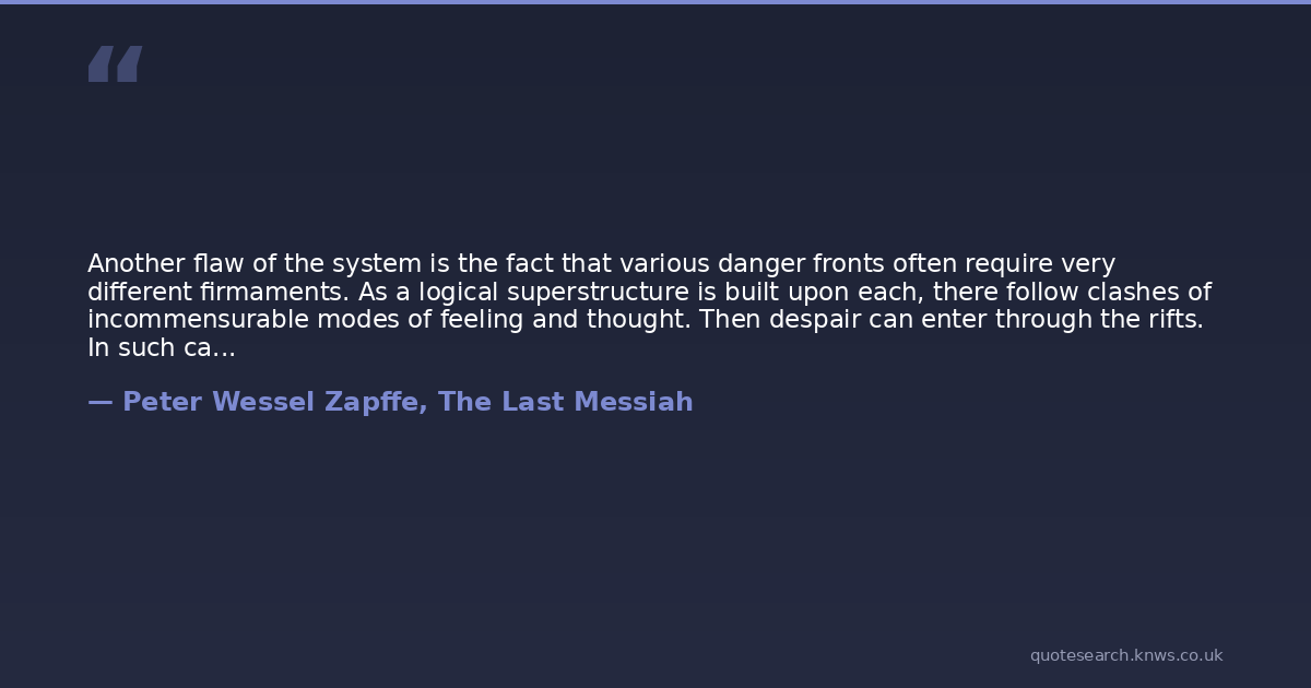Another flaw of the system is the fact that various danger fronts often require very different firmaments. As a logical superstructure is built upon each, there follow clashes of incommensurable modes of feeling and thought. Then despair can enter through the rifts. In such cases, a person may be obsessed with destructive joy, dislodging the whole artificial apparatus of his life and starting with rapturous horror to make a clean sweep of it. The horror stems from the loss of all sheltering values, the rapture from his by now ruthless identification and harmony with our natures deepest secret, the biological unsoundness, the enduring disposition for doom.