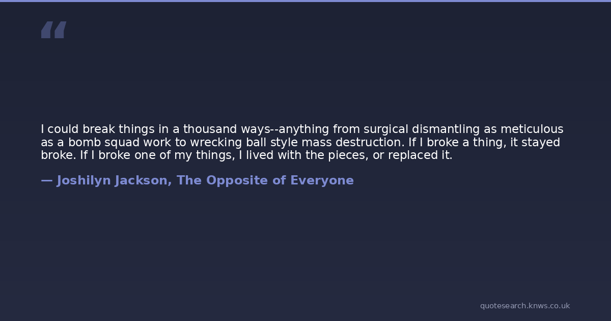 I could break things in a thousand ways--anything from surgical dismantling as meticulous as a bomb squad work to wrecking ball style mass destruction. If I broke a thing, it stayed broke. If I broke one of my things, I lived with the pieces, or replaced it.