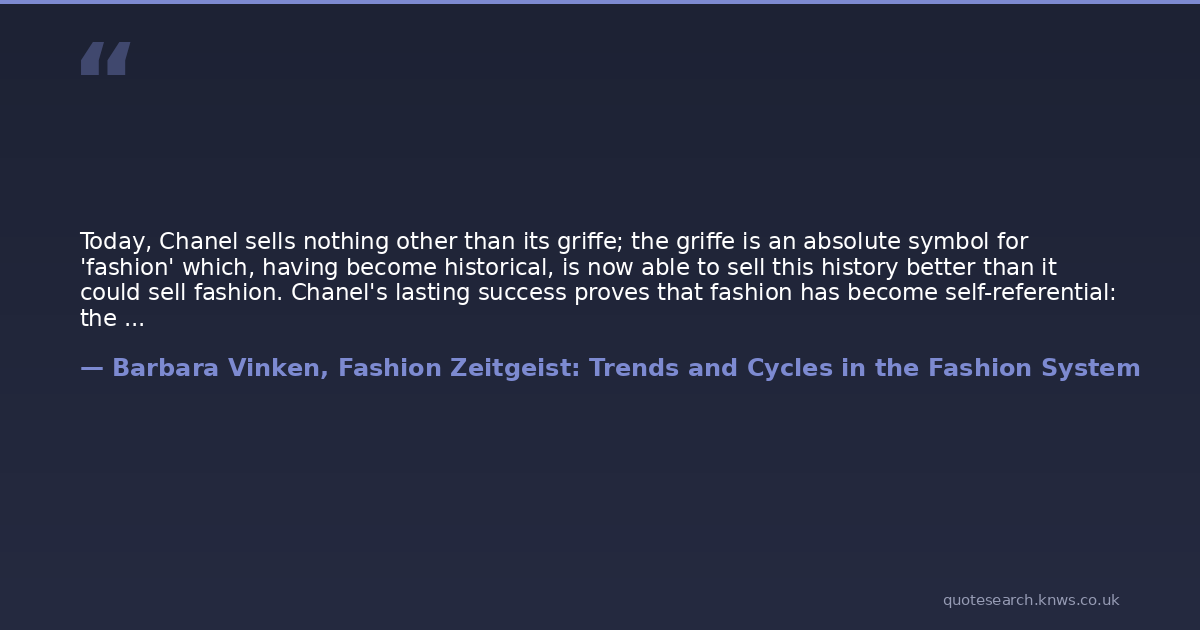 Today, Chanel sells nothing other than its griffe; the griffe is an absolute symbol for 'fashion' which, having become historical, is now able to sell this history better than it could sell fashion. Chanel's lasting success proves that fashion has become self-referential: the fetish of the mere name shows how it has begun to revolve around itself. The House of Chanel produces what Coco most abhorred: a thing of the past, dead. The visible, outwardly displayed griffe has become the opposite of individualized style: instead it confirms the latent uniform collectivity, which had always defined Chanel-wear; in the end, it signifies membership of an expensive club. The Chanel woman does not want to display her own taste, she wants to belong. In order to be certain, she is laden with Chanel signs and accessories, like amulets to protect against the evil eye; on the pocket, on the belt, on the dress buttons, on the watch, on costume jewelry, proudly stand the initials of the founder of the house, to which she knows she belongs.