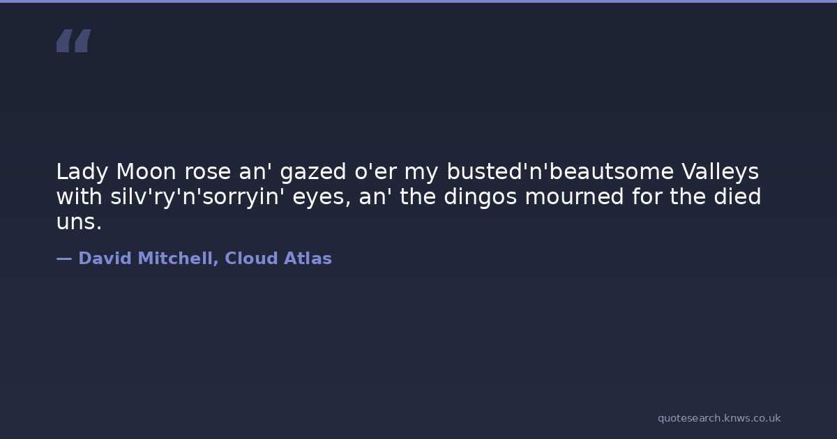 Lady Moon rose an' gazed o'er my busted'n'beautsome Valleys with silv'ry'n'sorryin' eyes, an' the dingos mourned for the died uns.