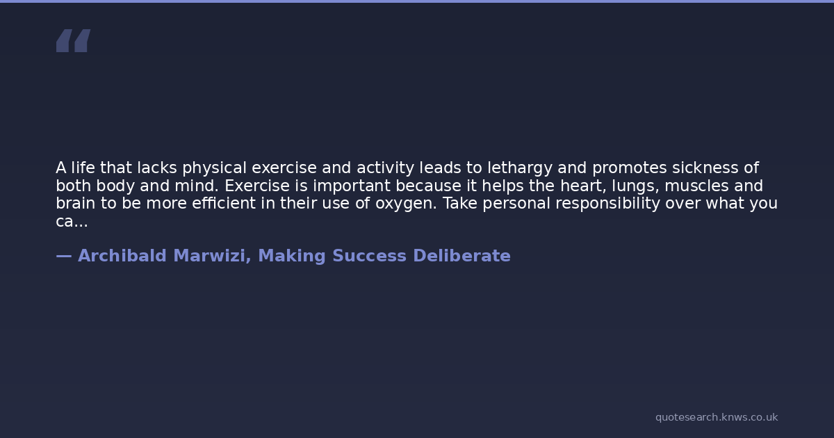 A life that lacks physical exercise and activity leads to lethargy and promotes sickness of both body and mind. Exercise is important because it helps the heart, lungs, muscles and brain to be more efficient in their use of oxygen. Take personal responsibility over what you can control its your life.